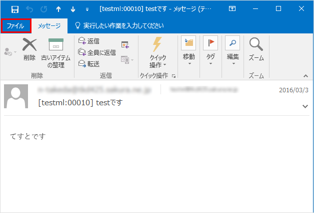 2対象のメールを一覧から選び、上部『 ファイル 』タブをクリックします。