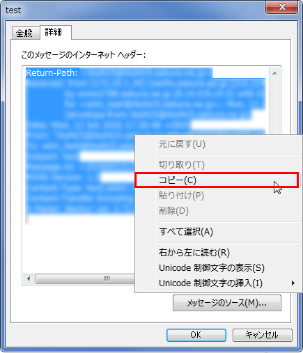 4メールの「ヘッダ情報」が表示されますので、テキストボックス内の文字列を全て選択後、右クリックし『 コピー(C) 』をクリックします。
