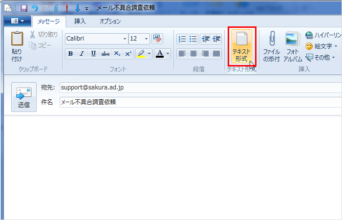 5メールの作成画面において、[書式]メニューから『 テキスト形式 』をクリックします。
