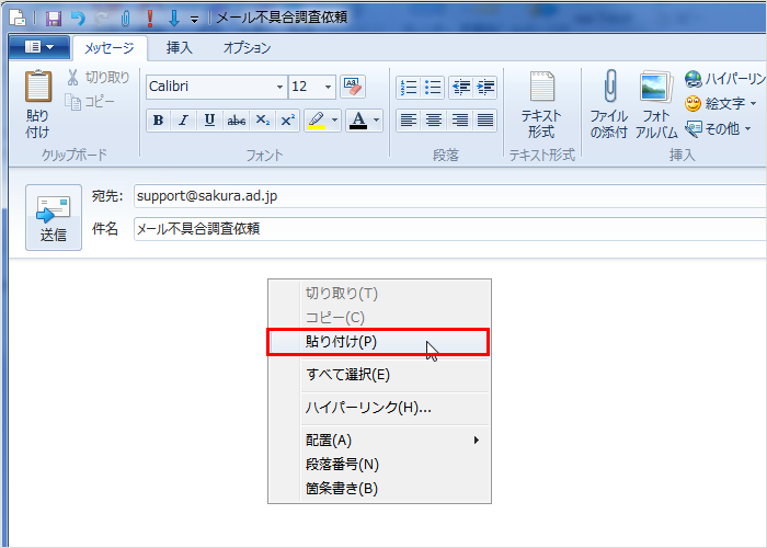 7メールの本文欄で右クリックし、『 貼り付け(P) 』をクリックします。