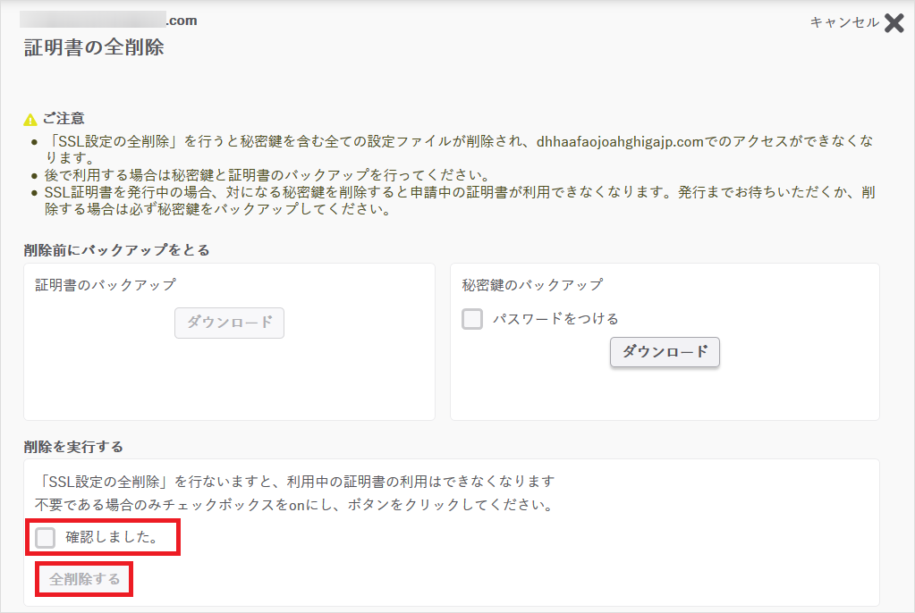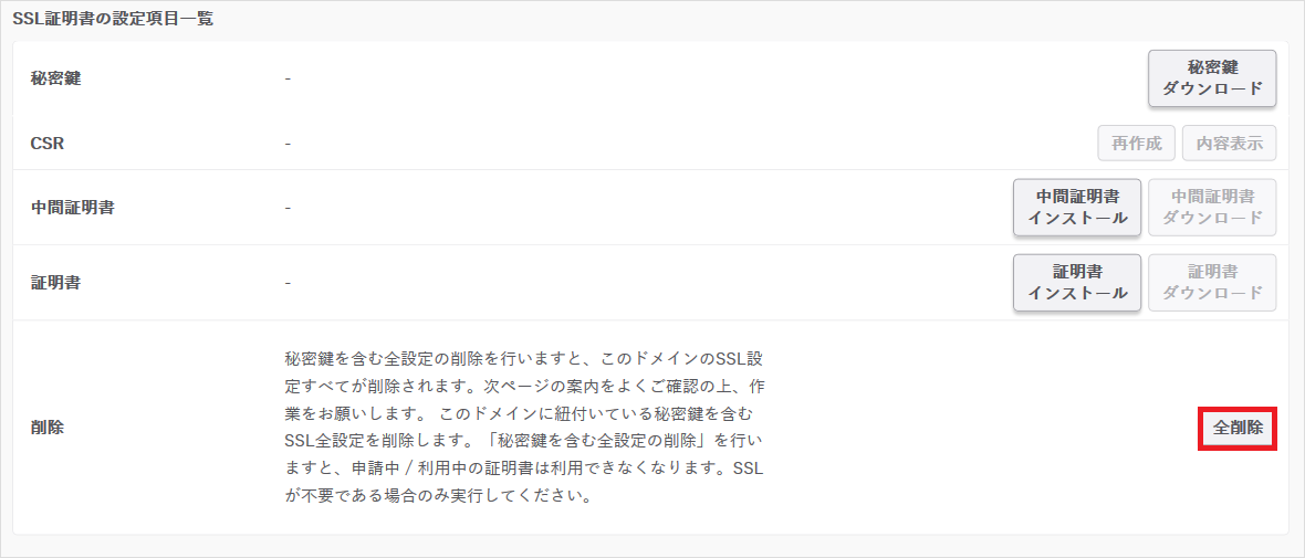 • 『SSL設定の全削除』を行うと秘密鍵を含む全ての設定ファイルが削除され、httpsでのアクセスができなくなります。