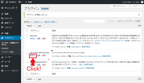 1『All In One WP Security & Firewall』をはじめ、WordPressのプラグインを有効化するには、WordPressの管理画面(ダッシュボード)にログインしてください。