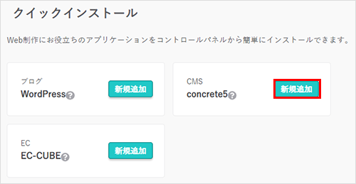 「クイックインストール」からは行えませんのでconcrete5の管理画面などから適宜実施ください。 - その他、拡張パッケージの導入前には基本仕様をご確認ください。