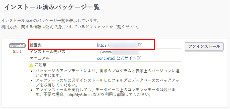 3インストール済みパッケージ一覧にインストールしたconcrete5が表示されます。