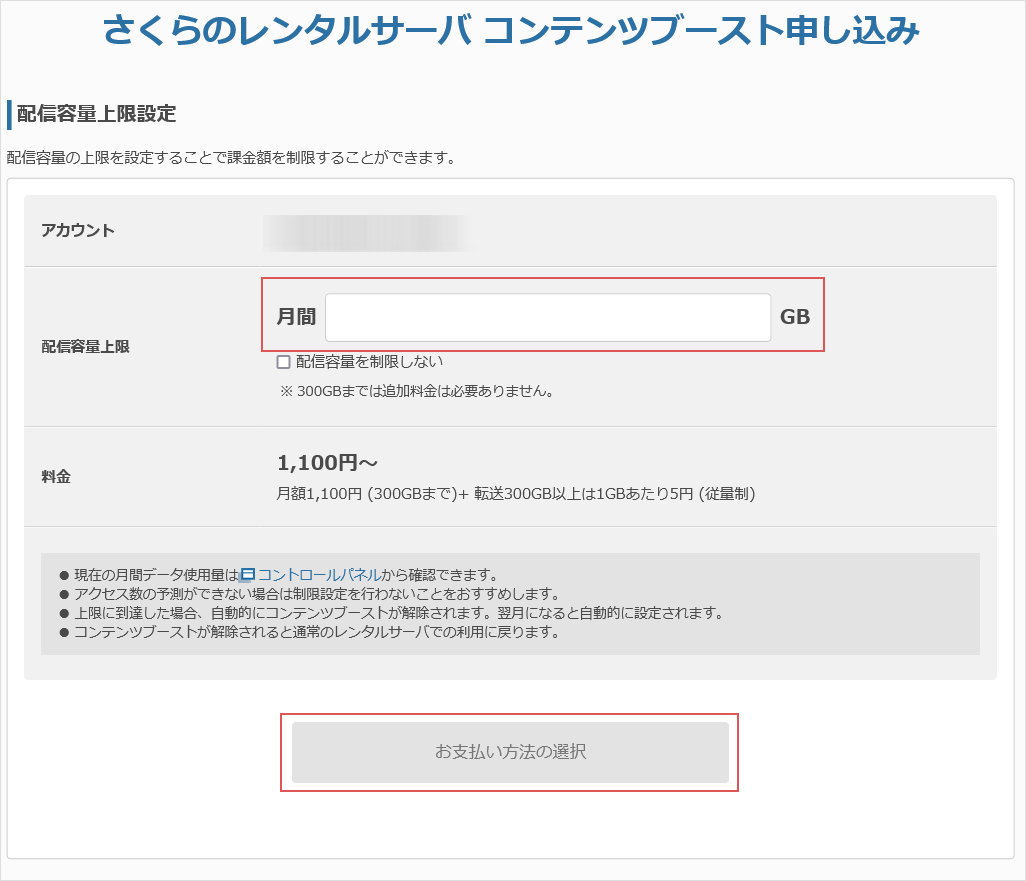 • 支払い方法はサーバーコントロールパネルからの利用登録時に設定できます。