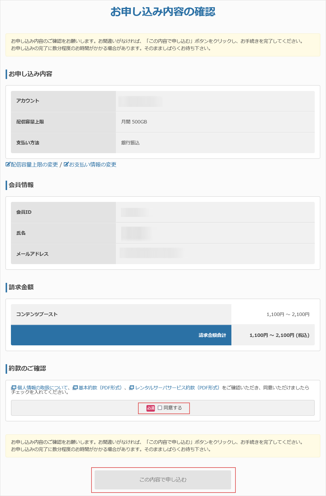 問題が無ければ[同意する]へチェックを入れ、『この内容で申し込む』をクリックします。