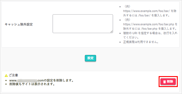 • キャッシュ除外設定で新たに追加や削除した設定をすぐに反映させたい場合は、キャッシュ削除を行ってください。