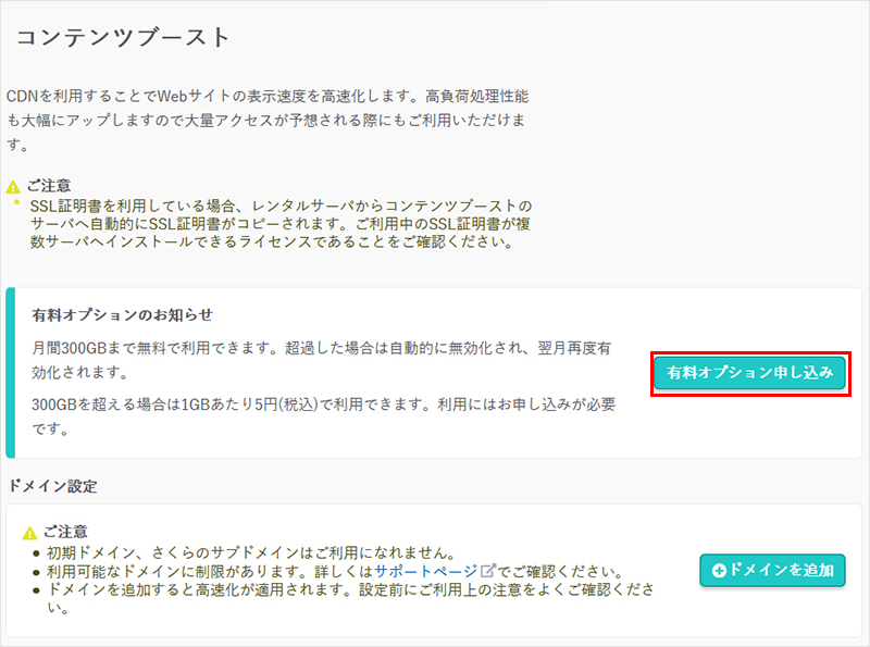 コンテンツブースト機能が利用できるかどうかはドメインとネームサーバーの利用状況によります。