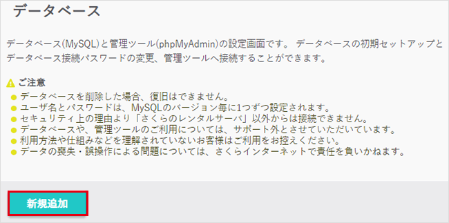 データベースの操作や仕組みを理解されていない場合はご利用をお控えください。 - データベースはプランごとにご利用可能数が異なります。