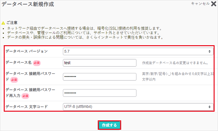 3作成するデータベースの情報を入力後、『作成する』をクリックします。