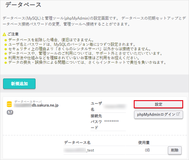 - 「データベース使用量」は、MySQL5.xをご利用の場合のみ表示されます。