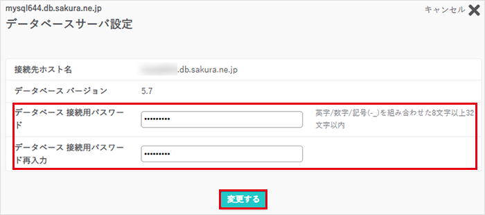 3「データベース接続用パスワード」と「データベース接続用パスワード再入力」に新しいパスワードを入力し『変更する』をクリックします。
