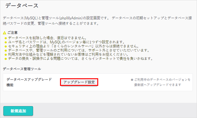 ※上記の場合、通常であれば不要なデータベース1個を削除することで本来はアップグレードできますが、MySQL5.1を複数利用されている場合のみ、MySQL5.1で利用中のデータベース分の個数の空きが必要です。