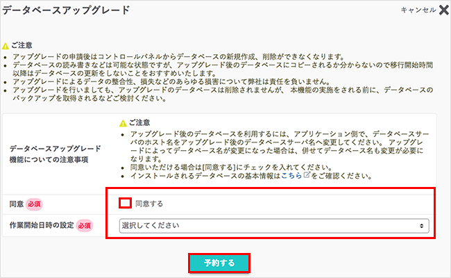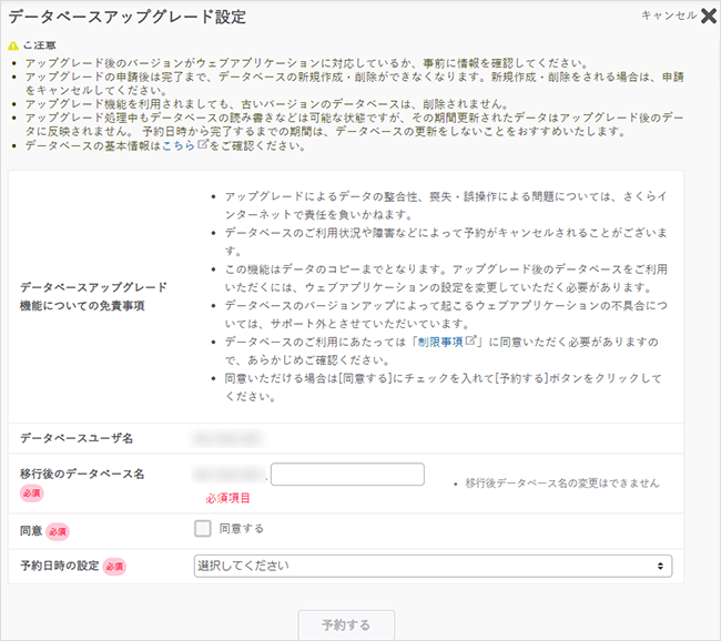 また、移行先のデータベースに、すでに同名のデータベースがあると予約することができません。