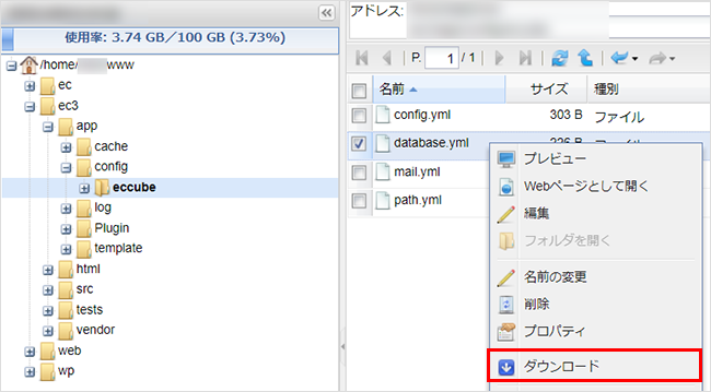 3設定ファイルを誤って削除してしまった時などの為に、切り戻しができるようデータベース情報が記述されている「database.yml」を編集を行う前にお手元のパソコンにダウンロードします。