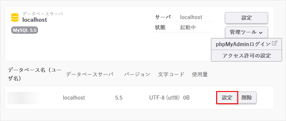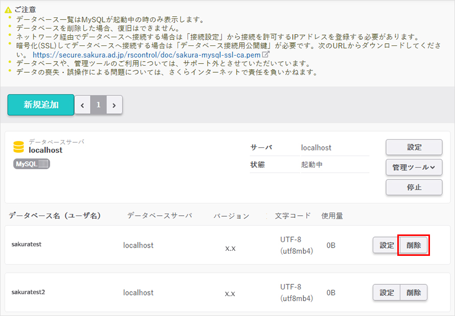 2該当データベース名の右側に表示している『削除』をクリックします。