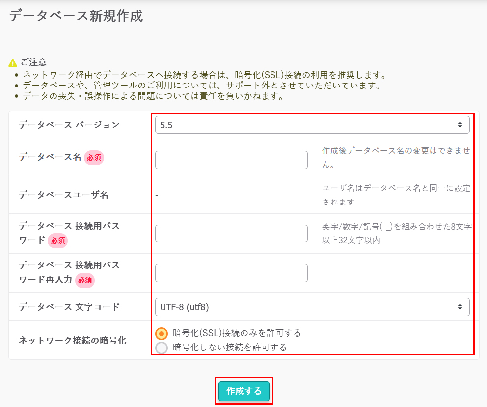 3作成するデータベースの情報を入力後、『作成する』をクリックします。