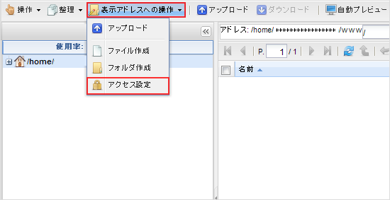 2上部メニューの『 表示アドレスへの操作 』をクリックし、『 アクセス設定 』を選択します。