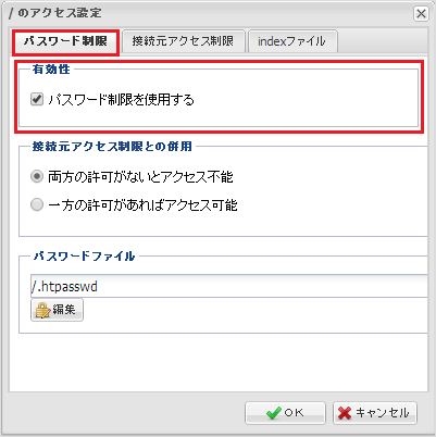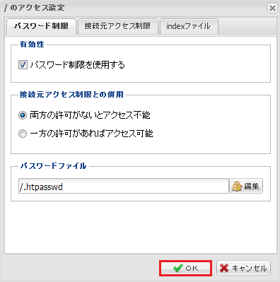 『 パスワード制限 』『 接続元アクセス制限 』のいずれか一方のタブに設定された条件を満たせば、アクセスが許可されるようになります。 |