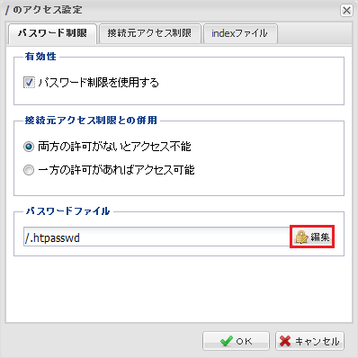 5『 パスワードファイル 』項目の、『 編集 』ボタンをクリックします。