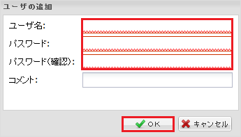 7ユーザの追加画面が表示されます。 『 ユーザ名 』『 パスワード 』『パスワード(確認) 』を入力し、『 OK 』ボタンをクリックします。