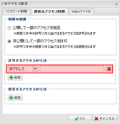 接続ホストやIPアドレスで制限をかけます。設定を行った下層フォルダに適用されます。