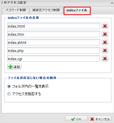 3アクセス設定画面が表示されます。『 indexファイル 』タブをクリックします。