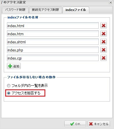 ファイル一覧を表示しない設定を行う際は、「indexファイルの名前の設定」をお願いします。