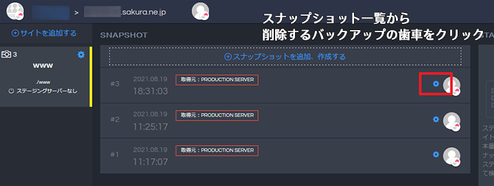 1削除したいバックアップの歯車のマークをクリックします。