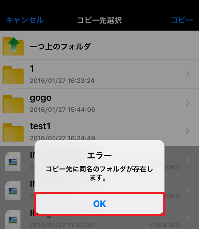 同じ名前のファイルがあるフォルダに「コピー」をする場合、確認画面が表示されます。