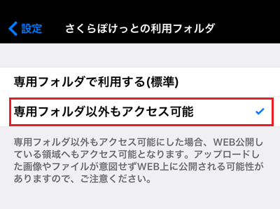 ※ さくらぽけっと専用フォルダ以外の利用については、意図せずファイルやフォルダがウェブ公開されたり、ウェブ公開しているファイル、フォルダを上書きしてしまう可能性がございます。ご注意ください。
