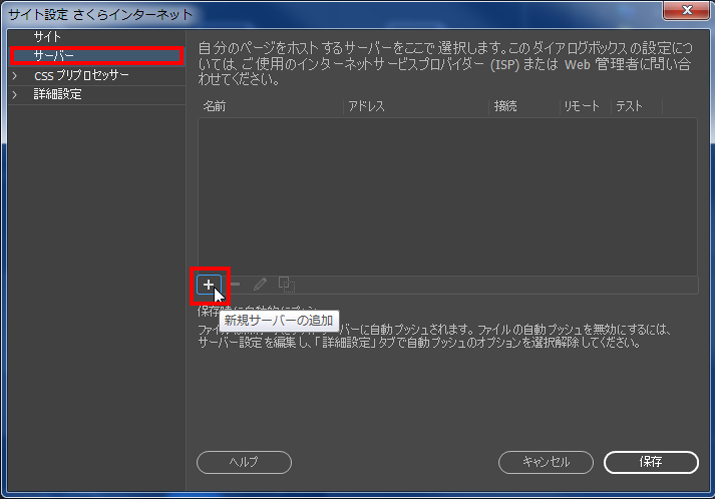 4『 サーバー 』を選択し、『 + 』ボタン(新規サーバーの追加)をクリックします。