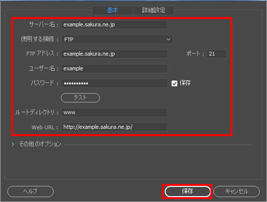 5ご利用サーバーの情報を入力し、『 保存 』をクリックします。