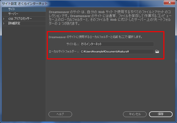 4『 サイト設定 』の画面が表示されます。「 サイト名 」と「 ローカルサイトフォルダー 」を入力します。