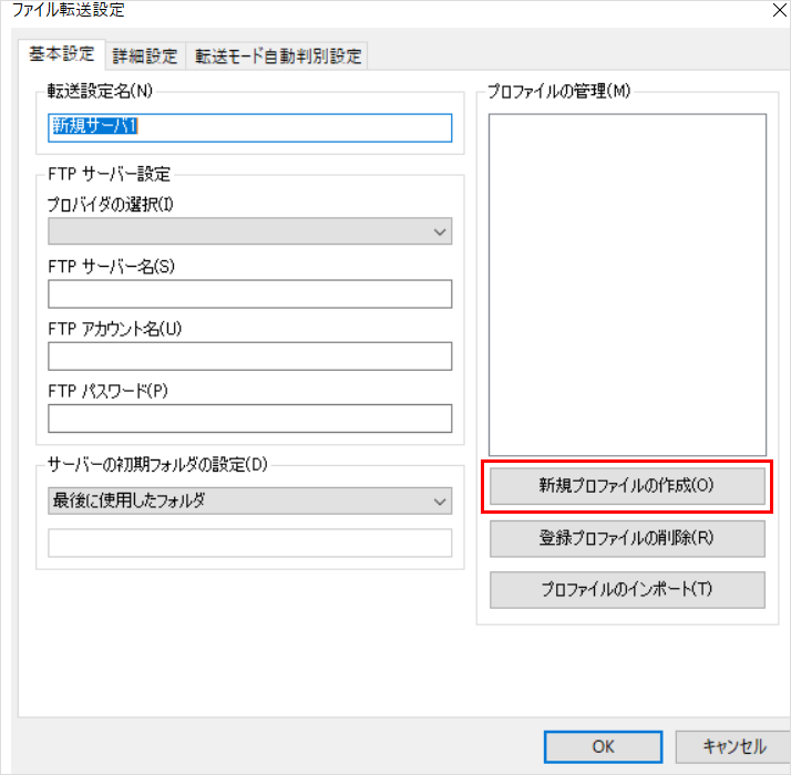 2ファイル転送設定の画面で、「新規プロファイルの作成」を選択します。
