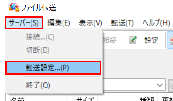 1ファイル転送の画面が表示されます。 「サーバー」のタブを選択し、「転送設定」をクリックします。