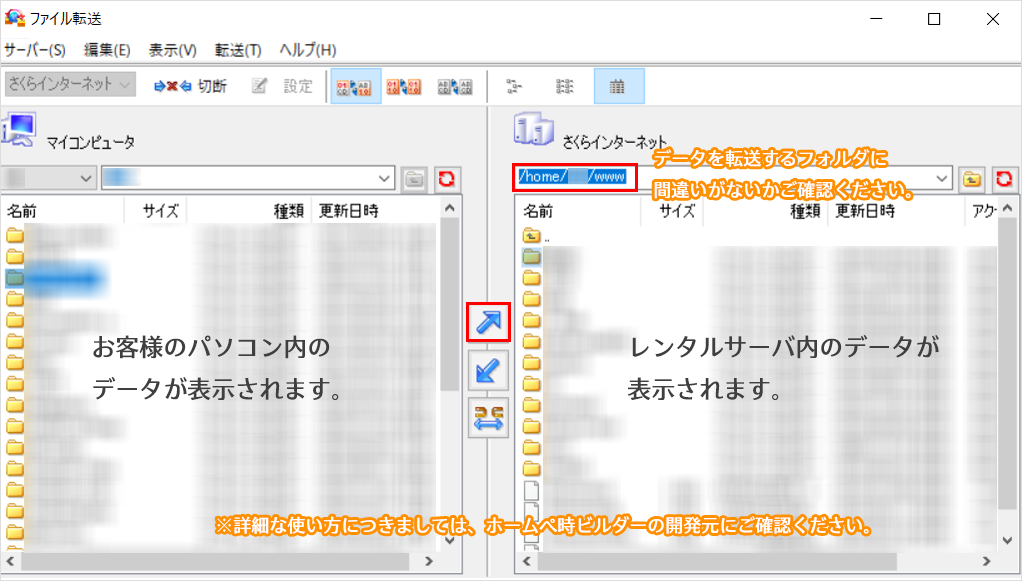 2サーバーへの接続を確認後、左側のウィンドウ(お客様の端末)からファイルを選択し、『斜め上向きの矢印』をクリックします