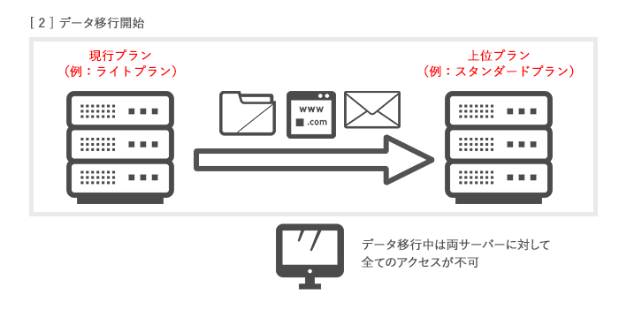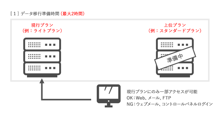 ※1:プラン変更準備中(申し込みボタンをクリックした後から移行作業の処理開始まで)はWeb、メール、FTP接続ともに利用できますが、サーバーコントロールパネル、ウェブメールへのログイン及び各種操作ができません。この時間は最大2時間程度を目安としています。プラン変更作業の開始(※2) とともにサーバーの全機能がご利用できなくなります。