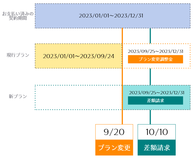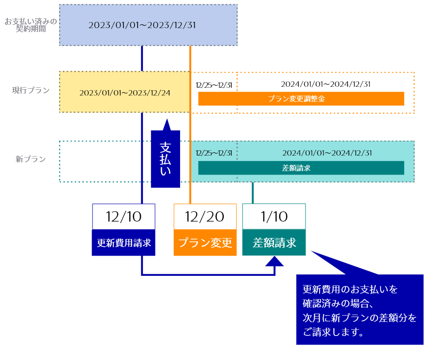 既にお支払い済みの更新費用より、現行プランご利用分の残りを新プランのご利用料金に充当してご請求いたします。