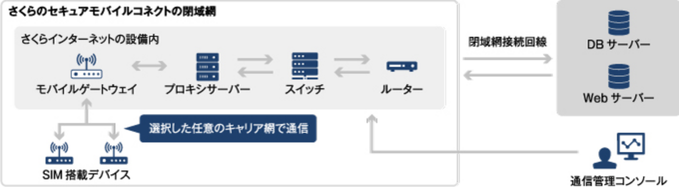 SIMからさくらのクラウドまでインターネットを経由しないセキュアなネットワークで通信されます。またサーバーへのアクセスは、VPNを利用することによりセキュリティを確保しつつ管理可能です。