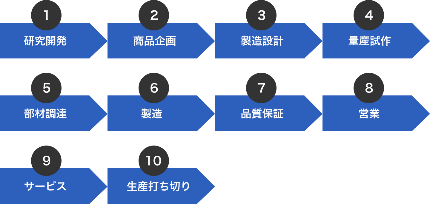 新製品が発表するまでには、開発費用や試作品の生産など、多額の先行投資が必要で、これを回収した後にやっと利益が生まれます。先行投資を回収するまでの期間(リードタイム)が短ければ、利益が生まれやすくなります。PLMにはTTP(Time To Profit)開発着手から開発費回収までの期間、TTV(Time To Volume)量産立ち上げまでの期間、TTM(Time To Market)新製品を市場に出すまでの期間の3つの要素が存在します。