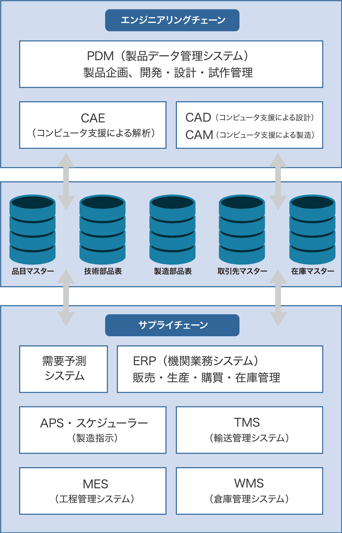 工場には「エンジニアリングチェーン」と「サプライチェーン」の2つの業務チェーンがあります。エンジニアリングチェーンを支える情報システムは図のようにPDM、CAE、CAD・CAMのデータに集約されます。サプライチェーンは、需要予測システム、ERP、APS・スケジューラ、TMS、MES、WMSなどが存在します。中間に存在するマスターとデータベースでは、品目マスター、E-BOM、M-BOM、取引マスター、在庫マスターが中継役として存在します。