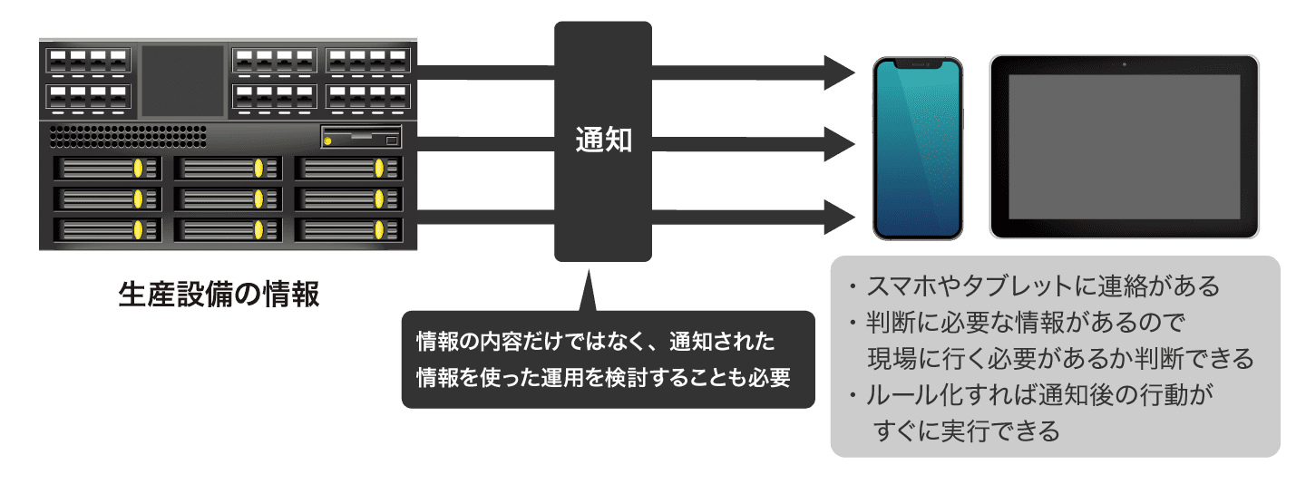 • 製造現場で異常が起こった際に速やかに対応するため、担当者のスマートフォンへ設備の警告情報をリアルタイムに届けるシステム
