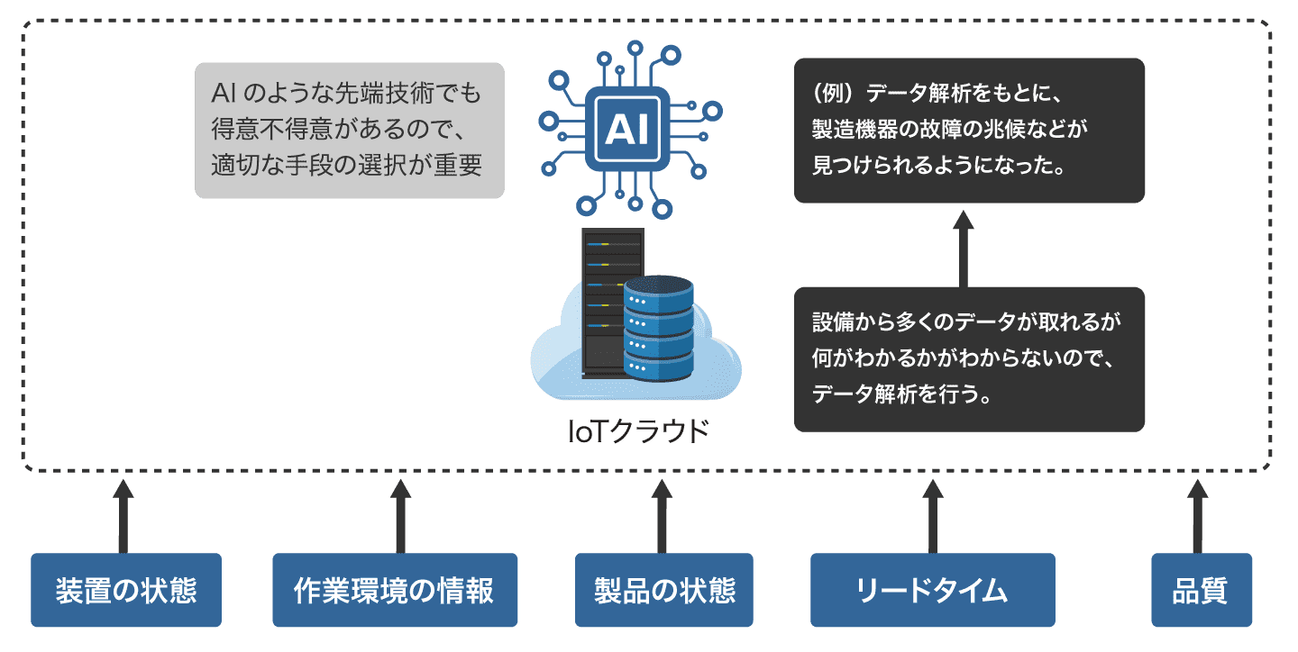 製造業における工場などで利用されるAIは、人間のような意識を持つ「汎用型AI」ではなく、意識のない「特化型AI」を利用することが多いです。特化型は、特定の分野やタスクに特化したAIですので、生産ライン自動化や品質管理など、異なるデータや技術に対応することができます。一方で数は少ないですが、汎用型の需要予測や在庫管理などデータ分析が中心となる業務では、人間のサポート的な位置づけで利用されることもあります。IoT技術で工場の機器などのモノと通信することで、クラウドに蓄積されたビックデータをAIで分析・解析し「見える化」します。見える化されたデータをもとに問題点を洗い出し、業務改善や製造工程の改善に伴い生産性向上が期待できます。