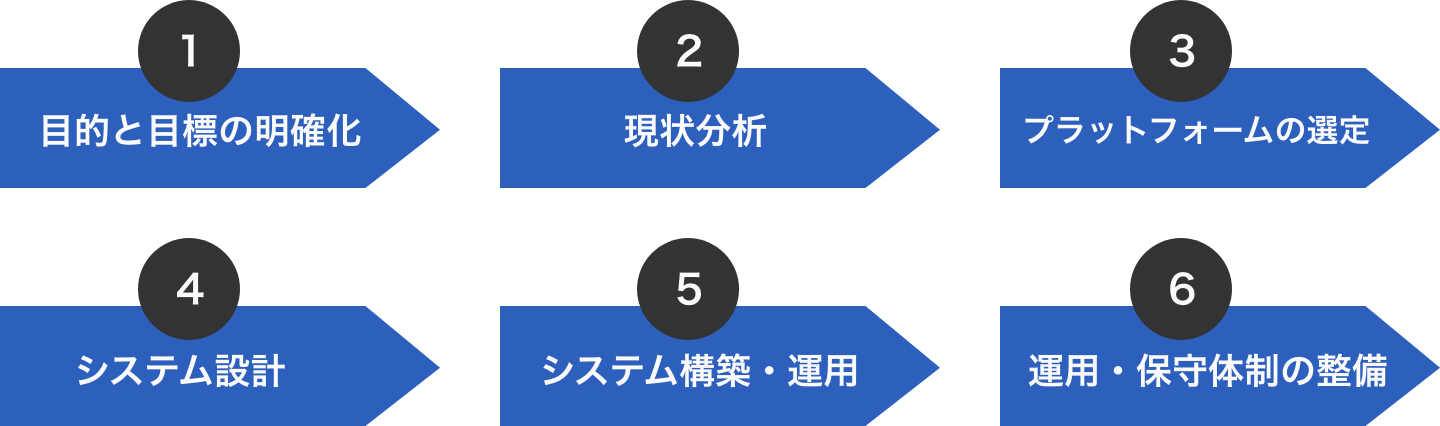 製造業のプラットフォーム導入は、製造プロセスの改善や新たな価値の創造につながる有効な手段です。しかし、プラットフォーム導入には、セキュリティリスクやデータの管理などの課題もあります。プラットフォームを導入する際には、これらの課題を十分に検討した上で、導入を検討することが重要です。具体的には下図のようなステップで考えます。