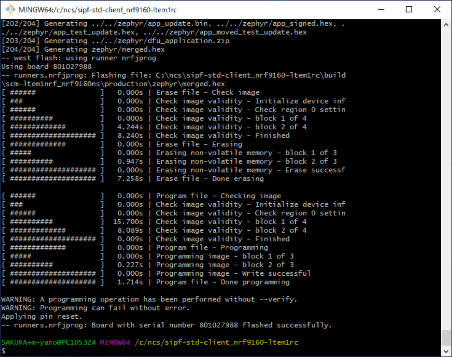 コンパイル後にnRF9160への書き込みまで自動で行う場合は次のシェルスクリプトを実行します。コンパイル完了後にJ-LINKを通してnRF9160にファームウェアの書込が開始されます。