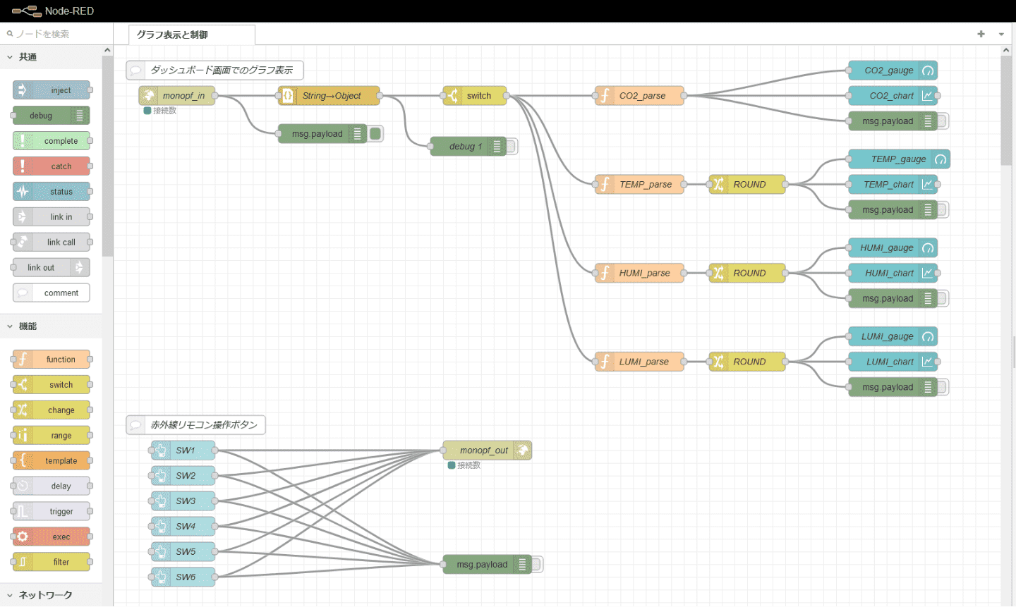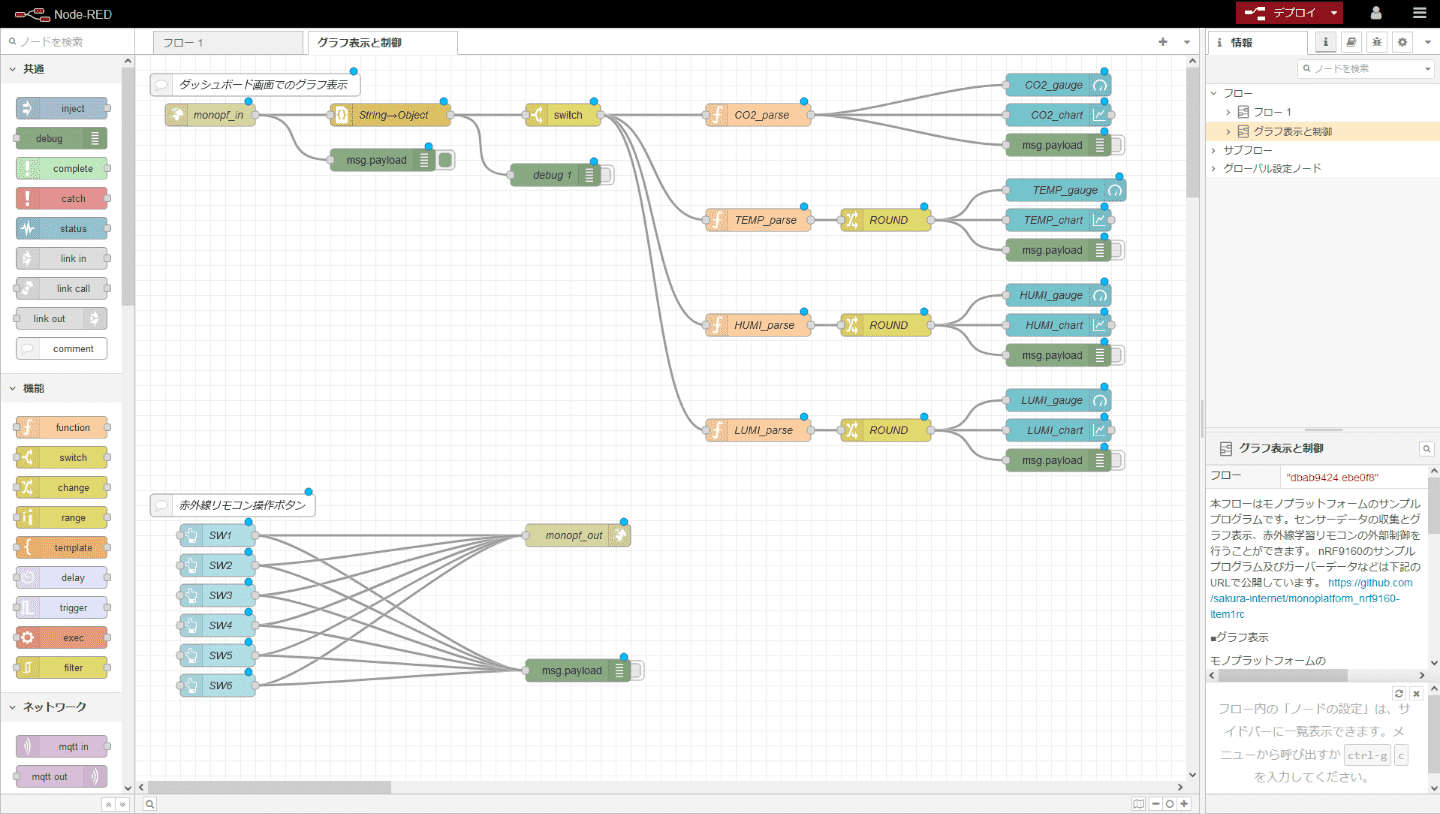 設計画面上でこのようにノードをつなげることでグラフの描画やボタンなどを配置することができます。Node-REDでモノプラットフォームと通信する方法を把握するためのサンプルを導入します。