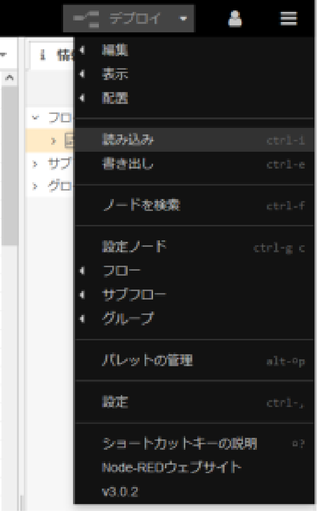次にJSON形式のフローデータを読み込みます。画面右上のハンバーガーボタンより、読み込みをクリック。
