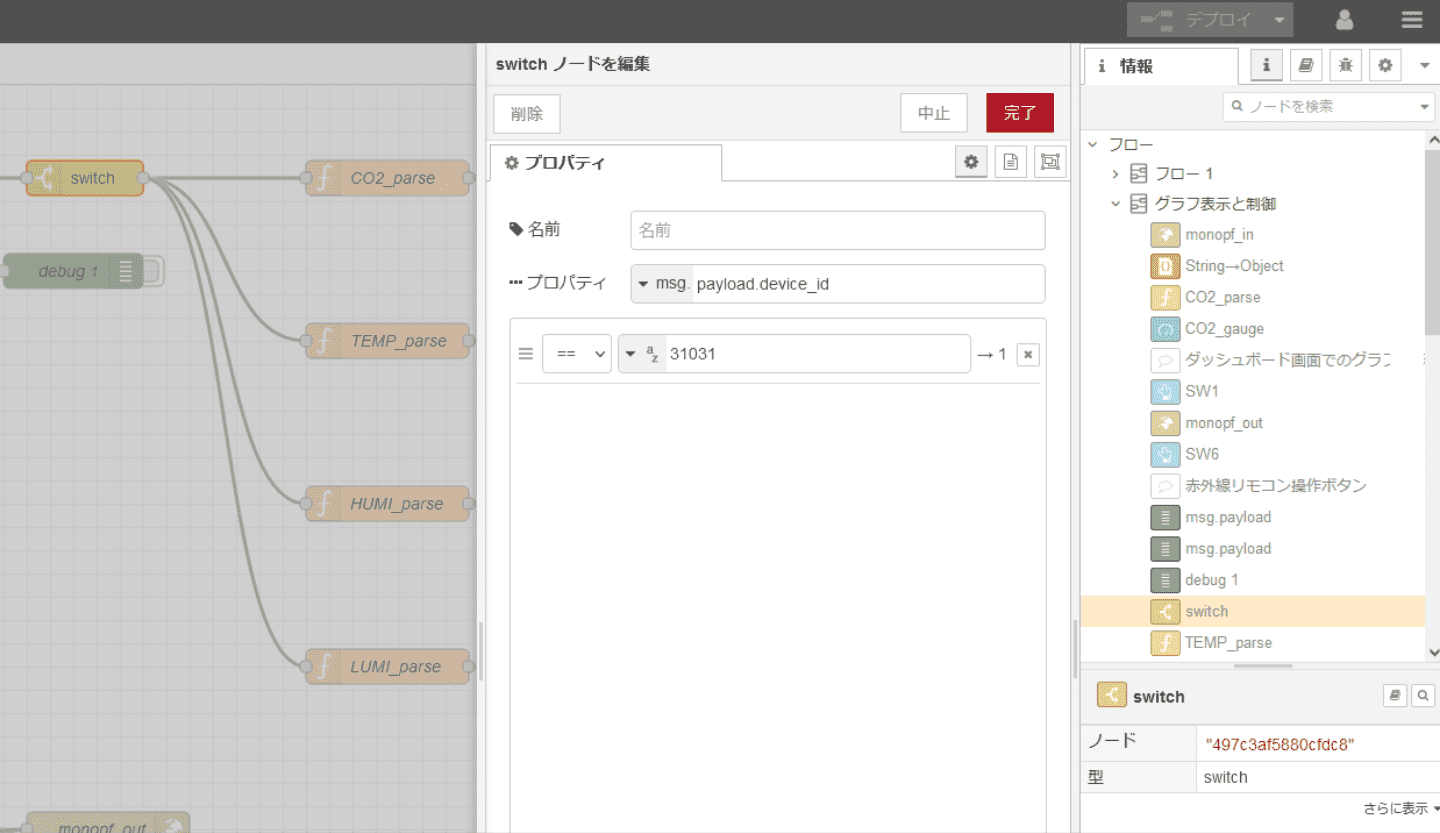 Node-REDのswitchノードにデバイスIDを記入して完了します。