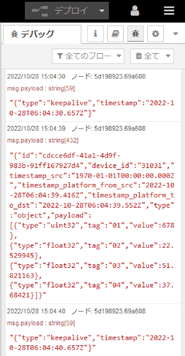 Node-REDの設計画面右上のデプロイボタンを押して完成です。LTEモジュールからデータが届いていれば、画面右側のデバッグタブにwebsoketに入力された値が表示されます。